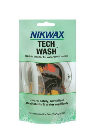 - Środek piorący NIKWAX Tech Wash 100ml. Bezdetergentowe mydło w płynie, do czyszczenia odzieży membranowej, oddychającej oraz sprzętu turystycznego, jak namioty, plecaki, futerały, sakwy rowerowe itp. Usuwa brud i regeneruje właściwości hydrofobowe.