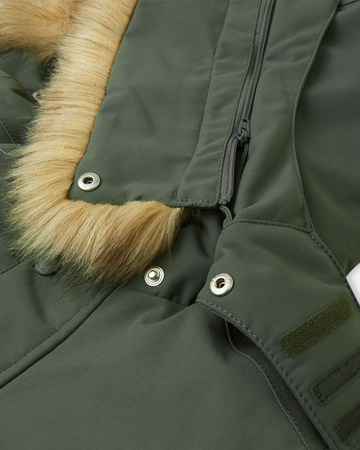 Wszystkie szwy klejone, wodoodporne;Bardzo trwały materiał;Gładka poliestrowa podszewka;Z izolacją Fellex® w 100% z recyklingu poliestru z certyfikatem bluesign®;Bezpieczny, odpinany i regulowany kaptur z odpinanym sztucznym futerkiem;Elastyczny mankiety;
